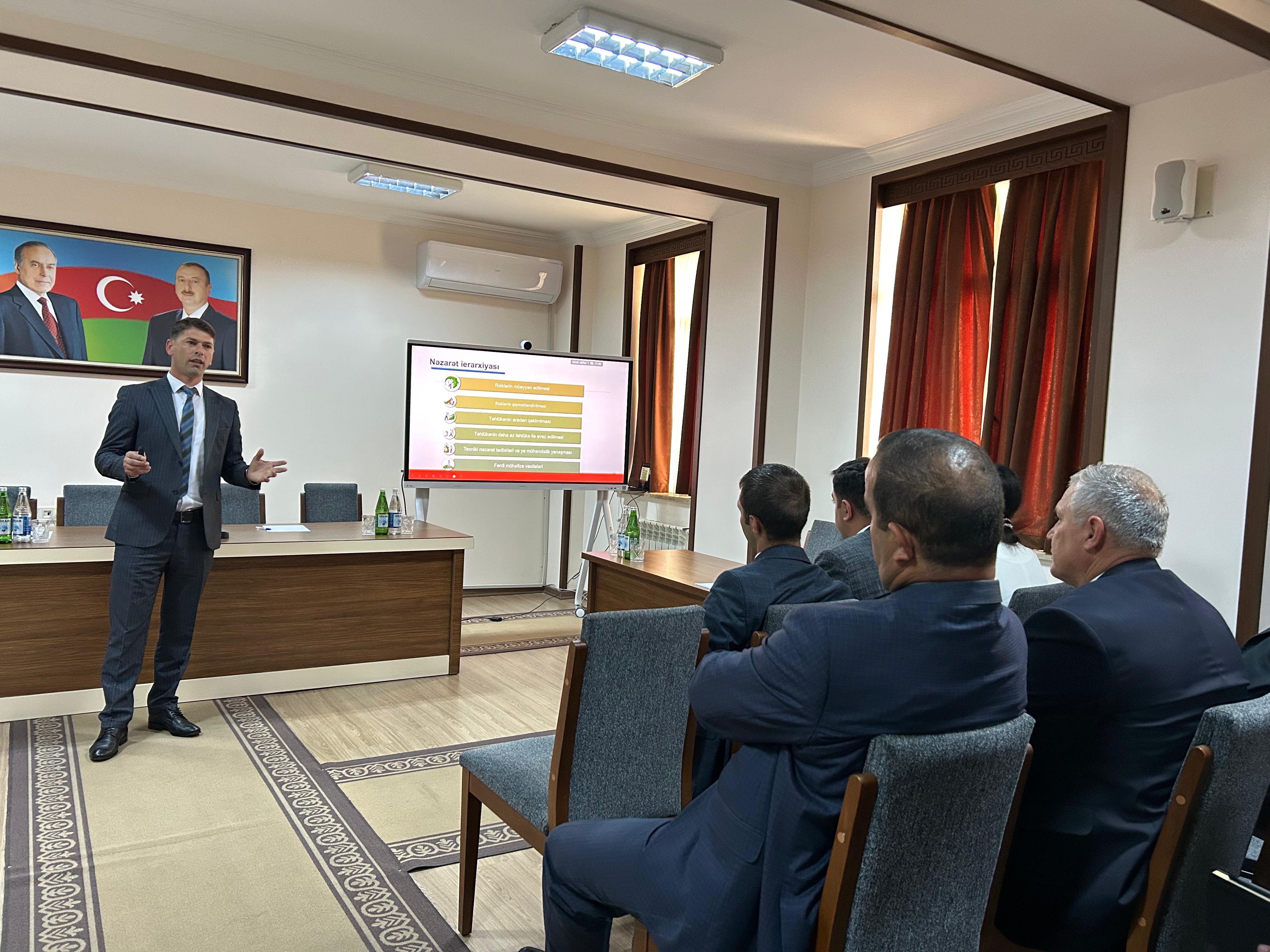 "İş yerlərində əməyin mühafizəsi, texniki təhlükəsizlik normalarına və qaydalarına əmək edilməsi, iş yerlərinin attestasiyasının keçirilməsi" mövzusunda keçirilən təlimdə işəgötürənlərə işçilər üçün iş yerlərində sağlam və təhlükəsiz əmək şəraitinin yaradılması, əməyin mühafizəsinə dair qanunvericiliyin tələbləri təqdimat əsasında izah olunub, iş yerlərində attestasiyasının keçirilməsi ilə bağlı məlumatlar verilib.