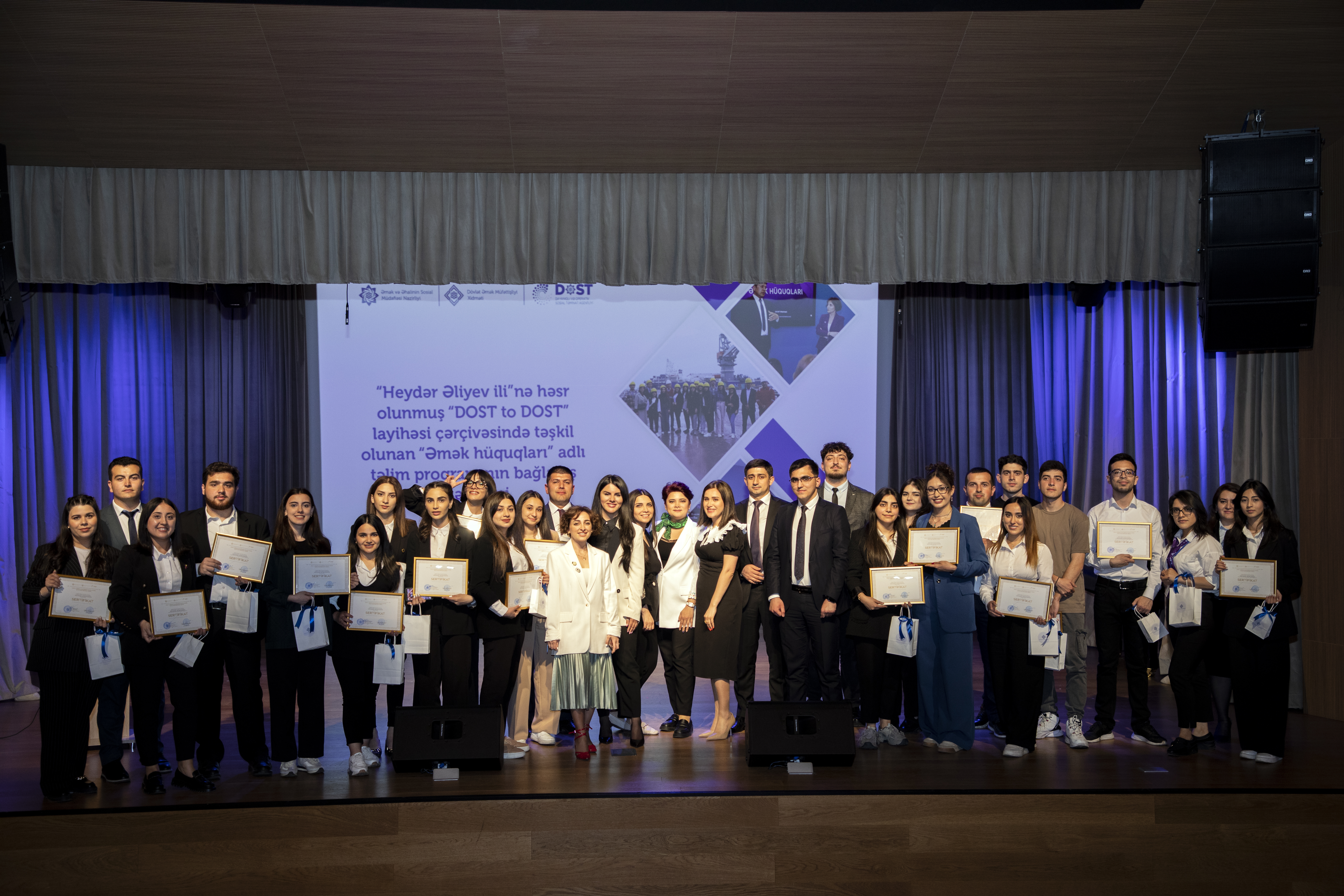 Əmək və Əhalinin Sosial Müdafiəsi Nazirliyi yanında Dövlət Əmək Müfəttişliyi Xidməti və Nazirliyin tabeliyindəki DOST Agentliyinin birgə layihəsi (“DOST to DOST”) çərçivəsində 8 may tarixində keçirilmiş “Heydər Əliyev İli”nə həsr olunmuş “Əmək hüquqları” adlı təlim proqramının yekun tədbirində “DOST könüllülər”inin təlim prosesində əldə etdikləri biliklərin qiymətləndirilməsi məqsədilə “sosial-teatr” formatında qrup şəklində müsabiqə keçirilib və qaliblər müəyyən edilib.