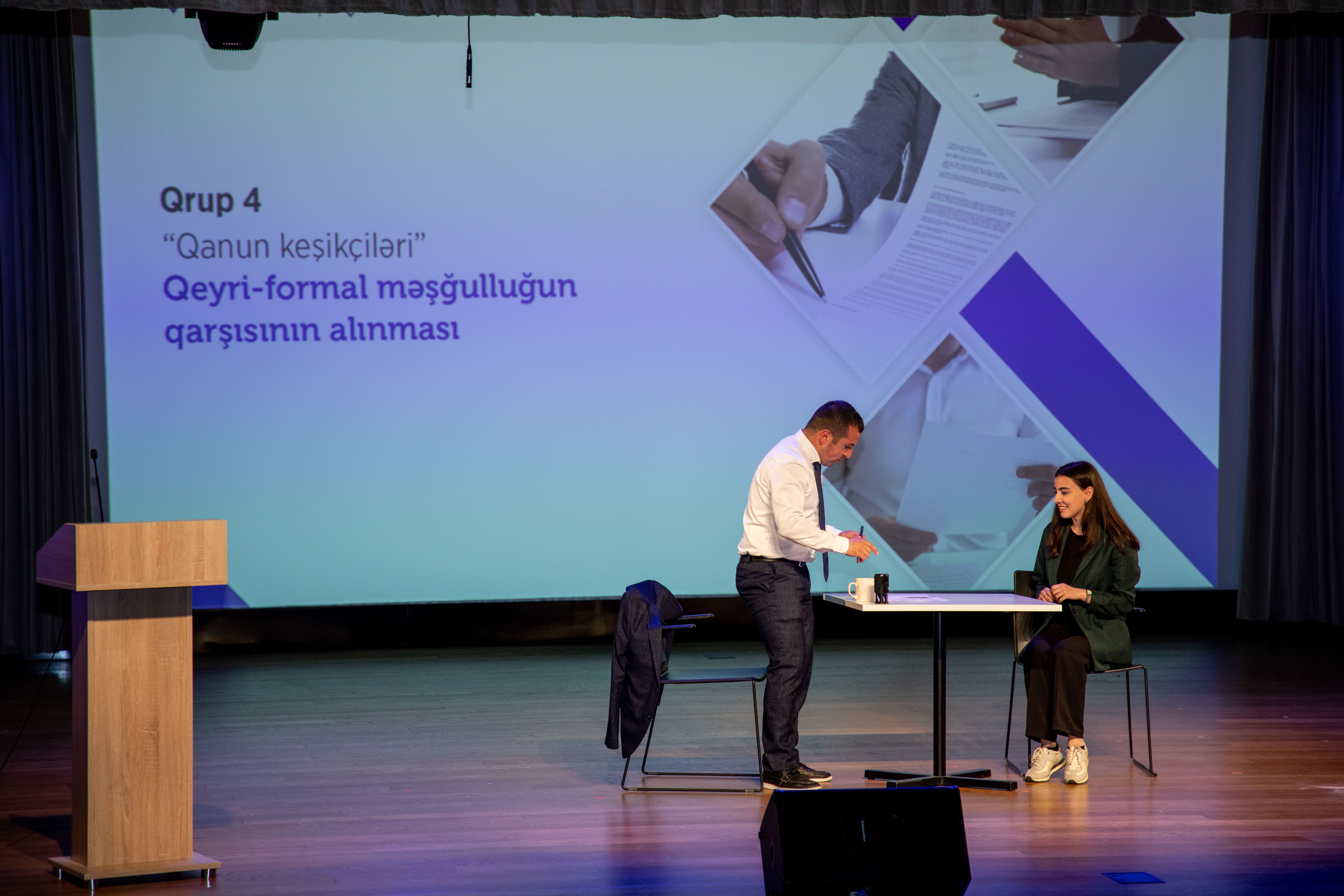 “Sosial-teatr” da iştirak edən könüllülər dörd qrupa bölünməklə çıxış ediblər. Qrupların mövzuları tikinti sektorunda təhlükəsizlik, analığın mühafizəsi, daş karxanalarında təhlükəli əmək şəraiti və qeyri-formal məşğulluğun qarşısının alınması olub. Teatrda çıxış edən könüllülər əmək hüquqlarının qorunmasının, qeyri-rəsmi məşğulluqla mübarizəninin vacibliyini diqqətə çatdırmağa çalışıblar. Müsabiqənin qalibi tikinti sektorunda təhlükəsizlik mövzusu ilə çıxış edən “Əməksevər DOSTlar” komandası olub. Qaliblərə və təlim iştirakçılarına hədiyyələr və sertifikatlar təqdim edilib.