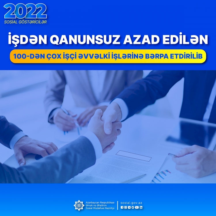 2022-ci il ərzində Əmək və Əhalinin Sosial Müdafiəsi Nazirliyi yanında Dövlət Əmək Müfəttişliyi Xidməti (DƏMX) müxtəlif müəssisələrdə 104 işçinin əmək müqaviləsinə qanunvericiliyin tələbləri pozulmaqla xitam verildiyini müəyyən edib.