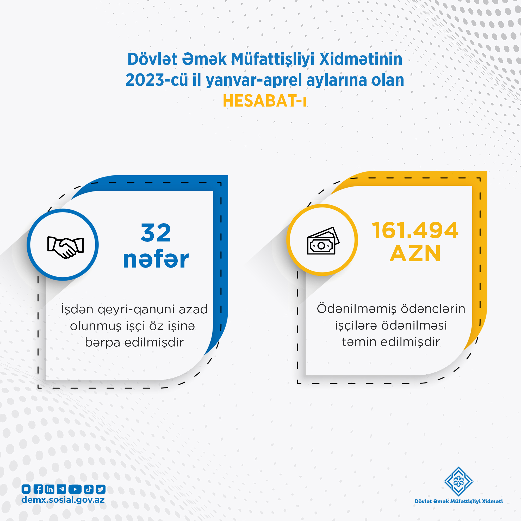 İşəgötürənlər tərəfindən 2023-cü ilin yanvar-aprel ayları ərzində ödənilməsi gecikdirilən 161 min manatdan çox məbləğdə ödənclər Əmək və Əhalinin Sosial Müdafiəsi Nazirliyi yanında Dövlət Əmək Müfəttişliyi Xidməti (DƏMX) tərəfindən görülən tədbirlər nəticəsində işçilərə ödənilib. Həmin vəsaitin 96,7%-i əmək haqları, qalan hissəsi isə zərərə görə ödənclər, mavinət və kompensassiyalar olub.