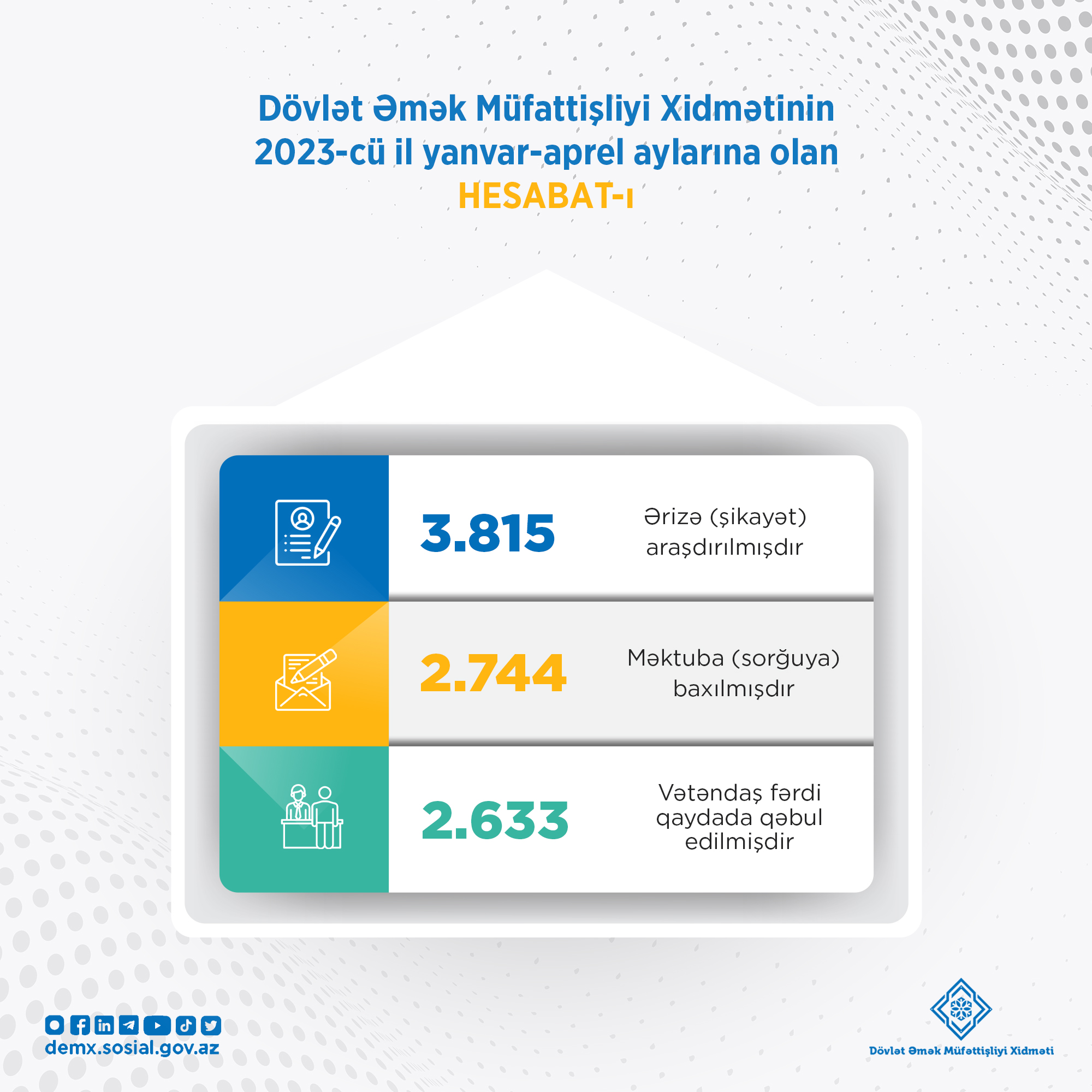 Qeyd edək ki, hesabat dövründə DƏMX tərəfindən 3815 sayda ərizə (şikayət) araşdırılıb, 2744 məktuba (sorğu) baxılıb. Eyni zamanda Xidmətin rəhbər və vəzifəli şəxsləri tərəfindən 2633 vətəndaş fərdi qaydada qəbul edilib.