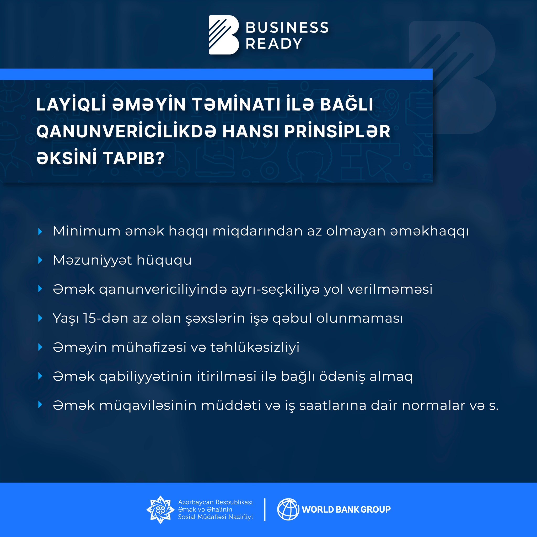 Əmək münasibətləri və məşğulluğa dair milli qanunvericilikdə əksini tapan, biznes reytinqlər baxımından da önəmli olan vacib mövzularla bağlı https://sosial.gov.az/faydali/aciq-melumatlar/biznes-reytinqler-baximindan-emek-munasibetleri-ve-mesgulluga-dair-qanunvericilikde-vacib-meseleler linkindən də məlumat almaq olar.