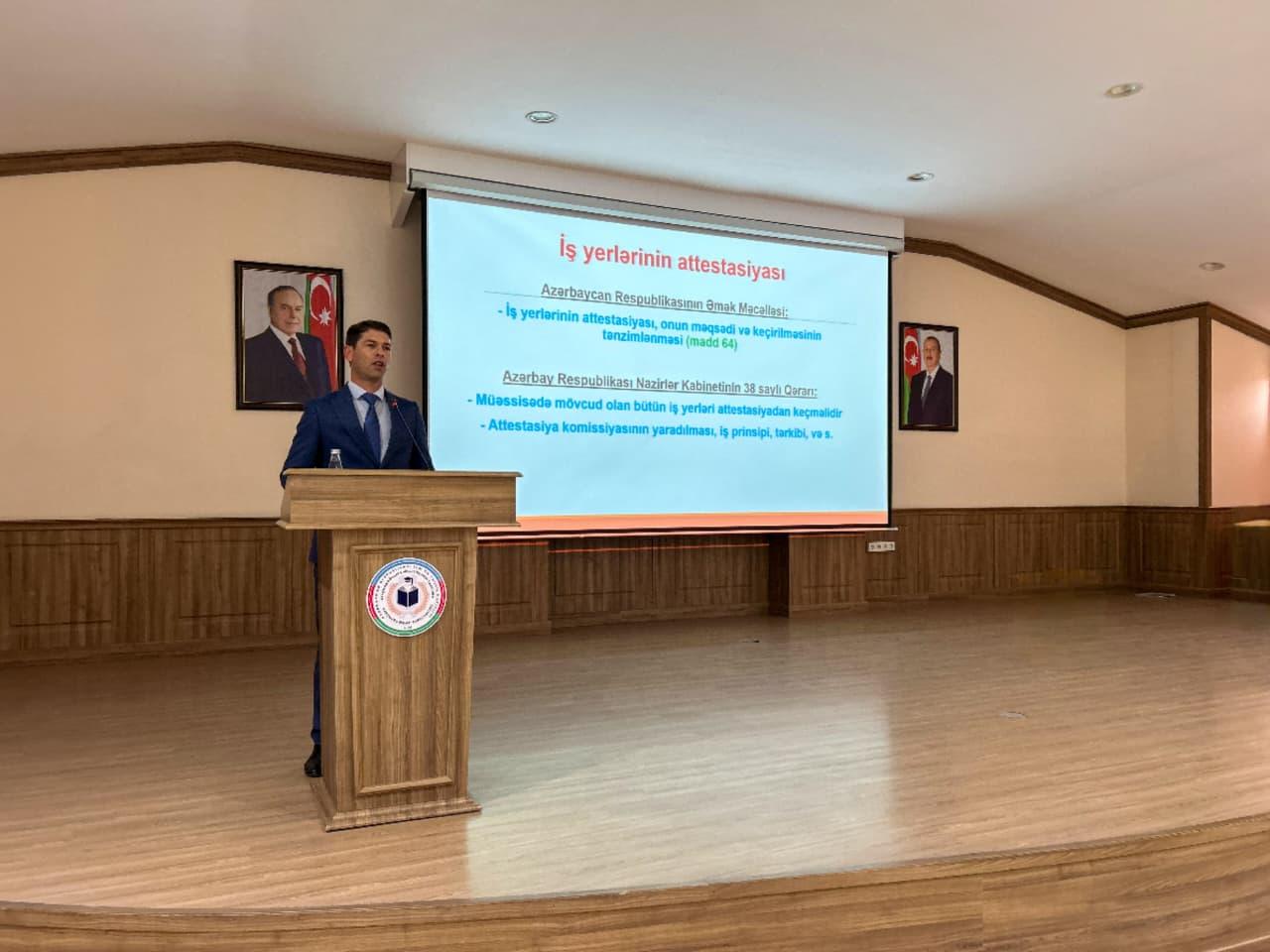 Naxçıvan şəhərində keçirilən təlim “İş yerlərində əməyin mühafizəsi, texniki təhlükəsizlik və iş yerlərinin attestasiyası” mövzusuna həsr edilib. Görüşdə kollecin 112 nəfər müəllim və tələbəsi iştirak edib.