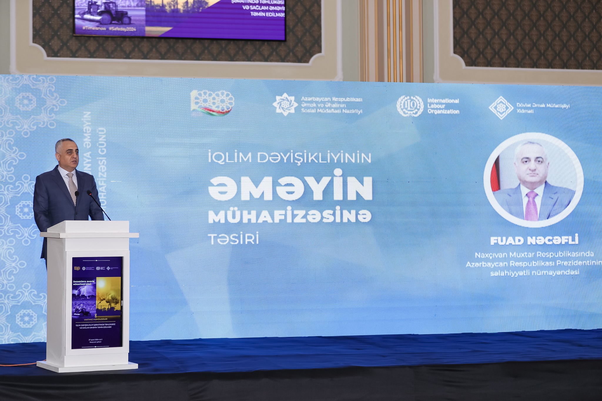 Naxçıvan Muxtar Respublikasında Azərbaycan Respublikası Prezidentinin səlahiyyətli nümayəndəsi Fuad Nəcəfli Naxçıvan MR-in 100 illik muxtariyyət tarixindən bəhs edib. O, muxtar respublikanın inkişafında Ümummilli Lider Heydər Əliyevin misilsiz xidmətlərini diqqətə çatdırıb. F.Nəcəfli Prezident İlham Əliyevin uğurlu daxili və xaricı siyasəti nəticəsində Azərbaycanın dinamik və hərtərəfli tərəqqisini, o cümlədən Naxçıvan MR-də davamlı inkişaf proseslərini qeyd edib. O, iqlim dəyişikliyinin fəsadlarını, iqlim dəyişmələri fonunda əməyin mühafizəsinin daha da aktuallaşdığını, bu baxımdan hazırda Naxçıvan şəhərində keçirilən bu konfransın önəmini diqqətə çatdırıb.