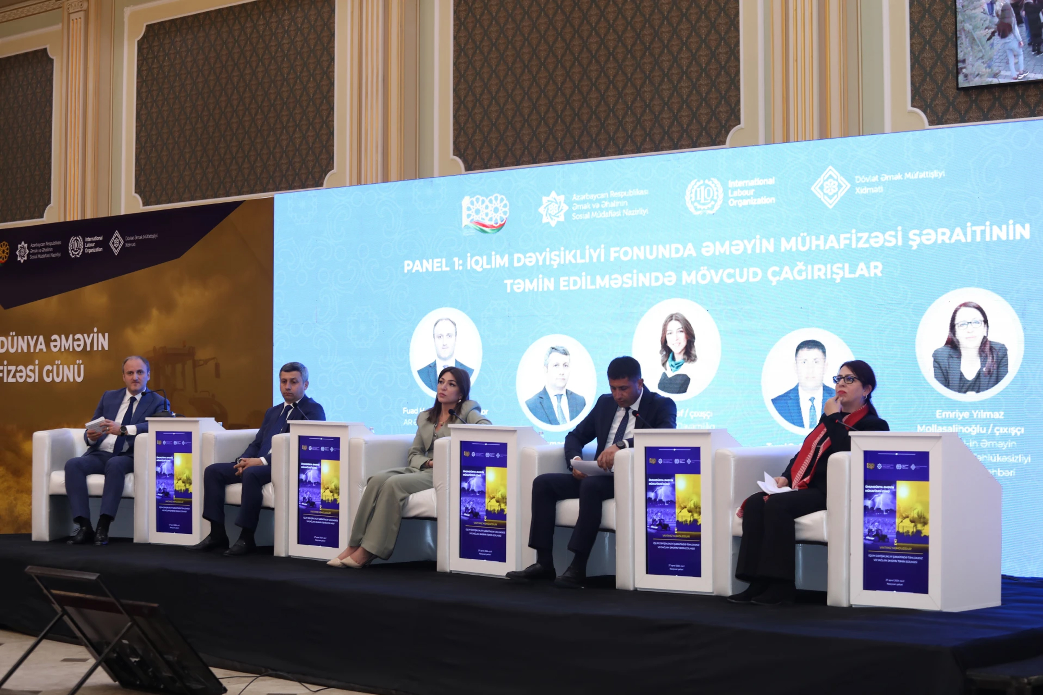 “İqlim dəyişikliyi fonunda əməyin mühafizəsi şəraitinin təmin edilməsində mövcud çağırışlar” və “Naxçıvan MR-də əməyin mühafizəsi sahəsində perspektivlər” mövzularında panel müzakirələr aparılıb.
