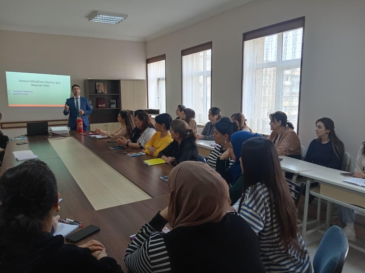 Əməyin Mühafizəsi Mərkəzinin Naxçıvan filialı tərəfindən təşkil olunan təlim “İş yerlərində əməyin mühafizəsi, elektrik və yanğın təhlükəsizliyi, istehsalatda baş verən bədbəxt hadisələr və ilk yardım qaydaları” mövzusuna həsr edilib. Müxtəlif kurslar üzrə keçirilən üç görüşdə ümumilikdə 80 nəfər iştirak edib.