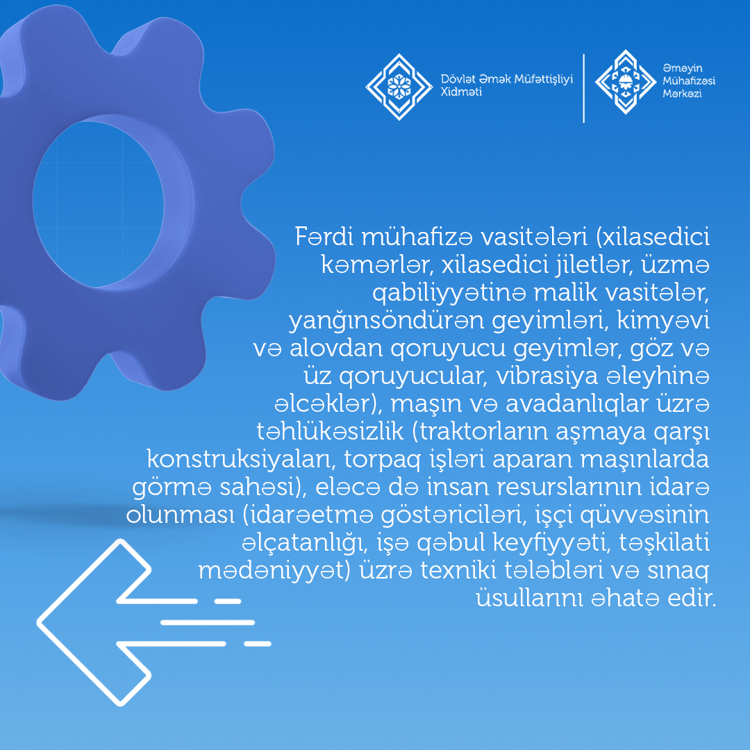 Fərdi mühafizə vasitələri (xilasedici kəmərlər, xilasedici jiletlər, üzmə qabiliyyətinə malik vasitələr, yanğınsöndürən geyimləri, kimyəvi və alovdan qoruyucu geyimlər, göz və üz qoruyucular, vibrasiya əleyhinə əlcəklər), maşın və avadanlıqlar üzrə təhlükəsizlik (traktorların aşmaya qarşı konstruksiyaları, torpaq işləri aparan maşınlarda görmə sahəsi), eləcə də insan resurslarının idarə olunması (idarəetmə göstəriciləri, işçi qüvvəsinin əlçatanlığı, işə qəbul keyfiyyəti, təşkilati mədəniyyət) üzrə texniki tələbləri və sınaq üsullarını əhatə edir.