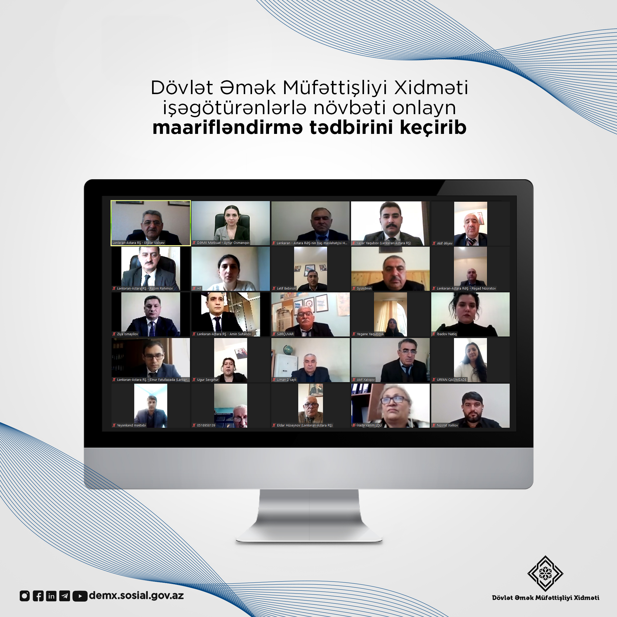 Əmək və Əhalinin Sosial Müdafiəsi Nazirliyi yanında Dövlət Əmək Müfəttişliyi Xidməti işəgötürənlər üçün "Uşaqların əmək hüquqları. Məcburi əmək və insan alverinin qarşısının alınması" mövzusunda növbəti maarifləndirici onlayn tədbir keçirib. Görüşdə 100-ə yaxın müəssisədən nümayəndə iştirak edib.