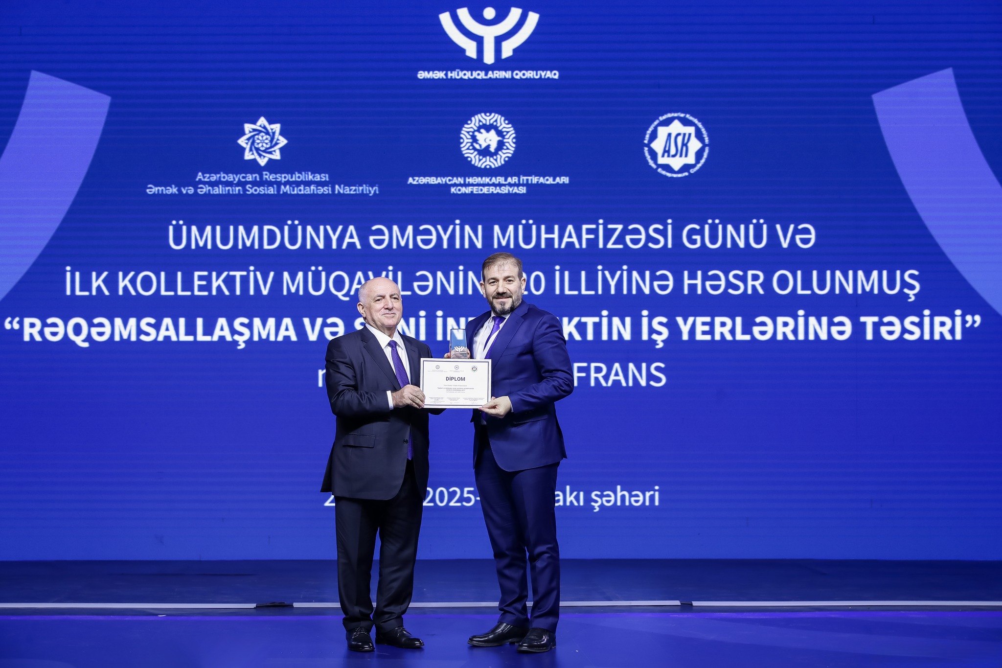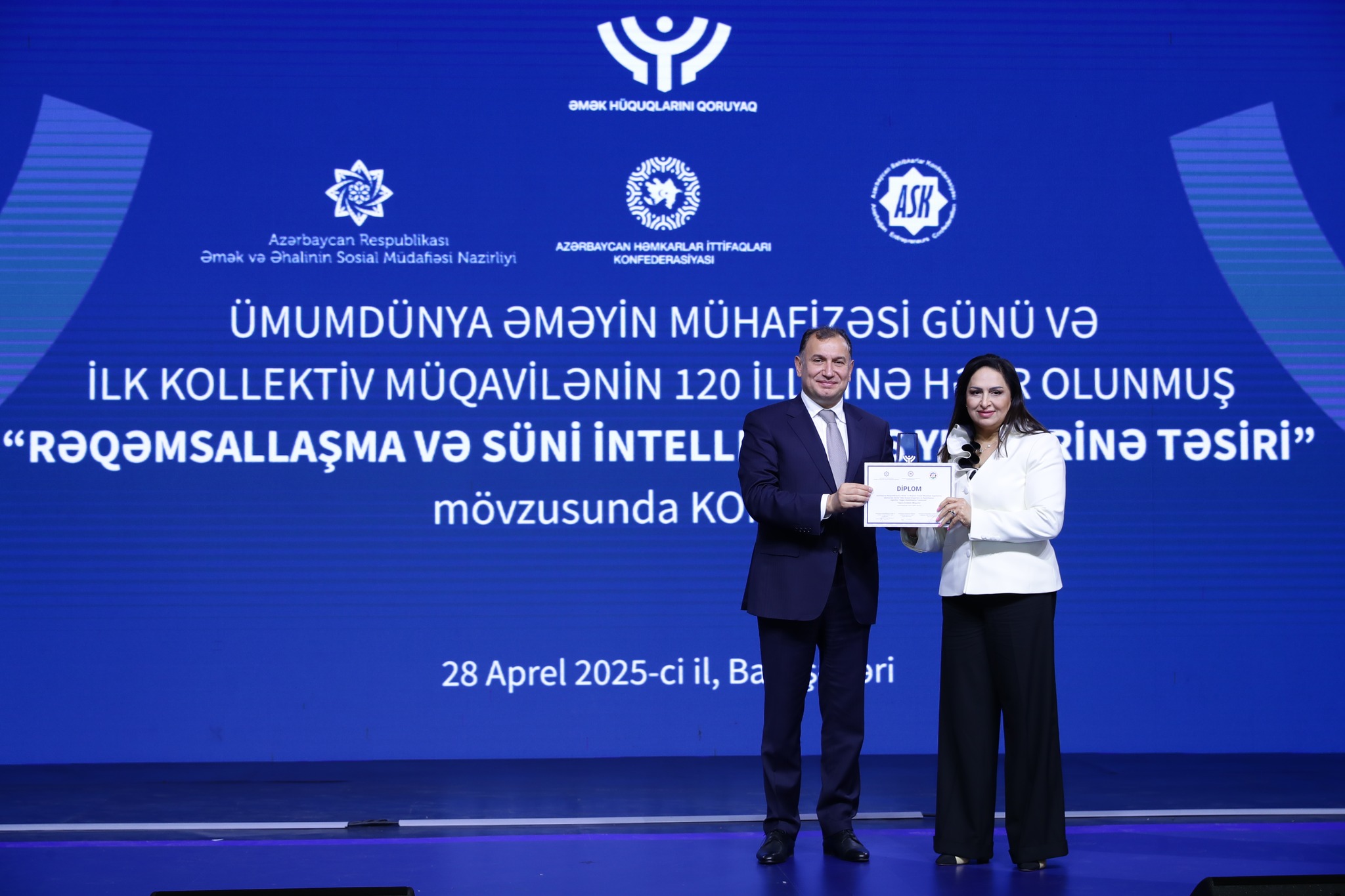 Əmək və Əhalinin Sosial Müdafiəsi Nazirliyi, Azərbaycan Həmkarlar İttifaqları Konfederasiyası (AHİK) və Azərbaycan Respublikası Sahibkarlar (İşəgötürənlər) Təşkilatları Milli Konfederasiyasının (ASK) birgə təşkilatçılığı ilə 28 Aprel – Ümumdünya Əməyin Mühafizəsi Günü və ilk kollektiv müqavilənin 120 illiyinə həsr olunmuş “Rəqəmsallaşma və süni intellektin iş yerlərinə təsiri” mövzusunda konfrans keçirilib. Tədbirdə dövlət və özəl qurumların, beynəlxalq təşkilatların nümayəndələri, həmçinin həmkarlar ittifaqlarının üzvləri iştirak ediblər.