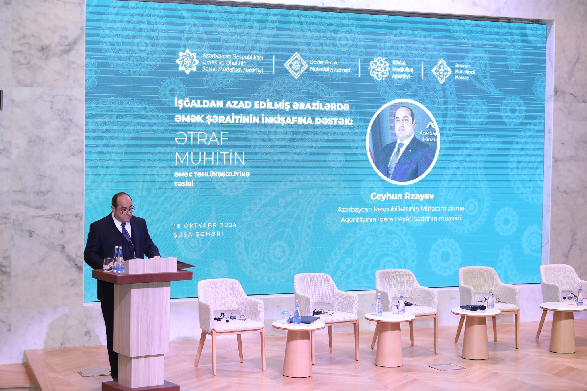 Şuşa rayonunda Azərbaycan Respublikası Prezidentinin xüsusi nümayəndəliyinin əməkdaşı Elşad İskəndərov tədbiri giriş sözü ilə açaraq, işğaldan azad edilmiş ərazilərdə əmək şəraitinin inkişafına dəstək, ətraf mühitin əməyin təhlükəsizliyinə təsiri mövzusunda Şuşada keçirilən bu konfransın əhəmiyyətini qeyd edib.