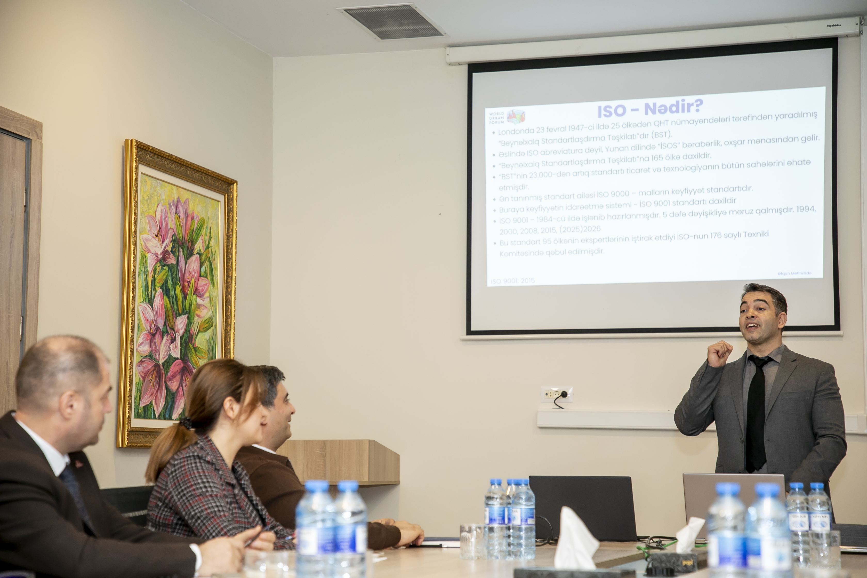 Həm əyani, həm də onlayn formatda keçirilən təlim “ISO 9001:2015 – Keyfiyyət İdarəetmə Sistemi”, “ISO 37001:2016 – Rüşvətə qarşı İdarəetmə Sistemi” və “ISO 45001:2018 – Əməyin Mühafizəsi və Təhlükəsizlik Texnikası İdarəetmə Sistemi” mövzularına həsr olunub.