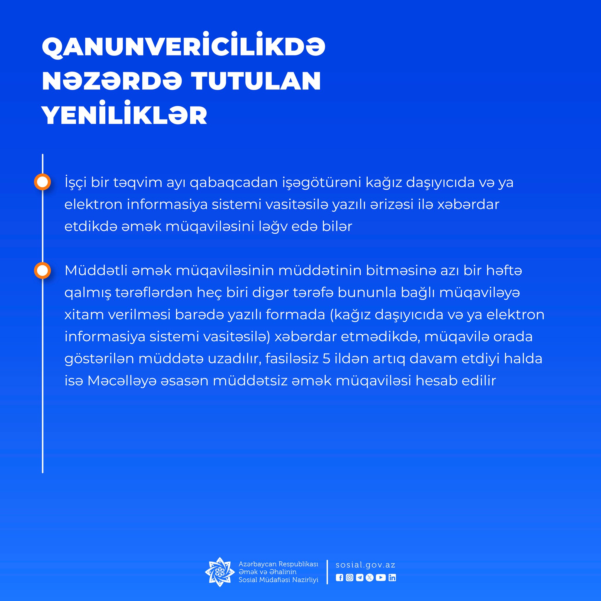 Yeni qanunvericilik aktları əmək və məşğulluq sahələrində e-xidmətlərin genişləndirilməsi üçün normativ-hüquqi bazanın təkmilləşdirilməsinə xidmət edir