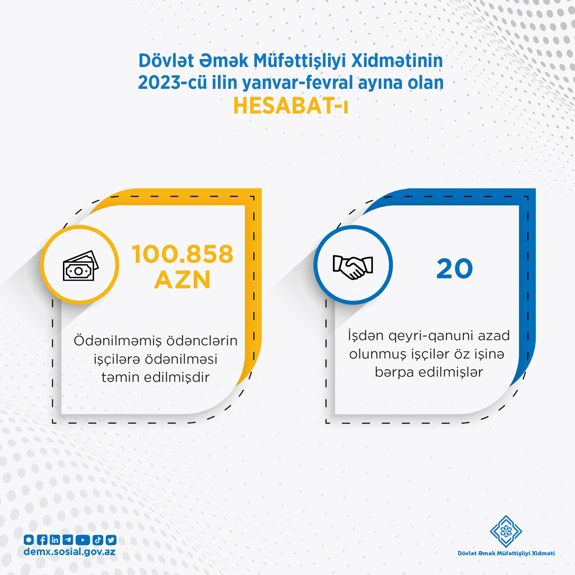 İşəgötürənlər tərəfindən 2023-cü ilin yanvar-fevral ayları ərinzədə ödənilməsi gecikdirilən 101 min manata yaxın məbləğdə ödənclər Dövlət Əmək Müfəttişliyi Xidməti (DƏMX) tərəfindən görülən tədbirlər nəticəsində işçilərə ödənilib