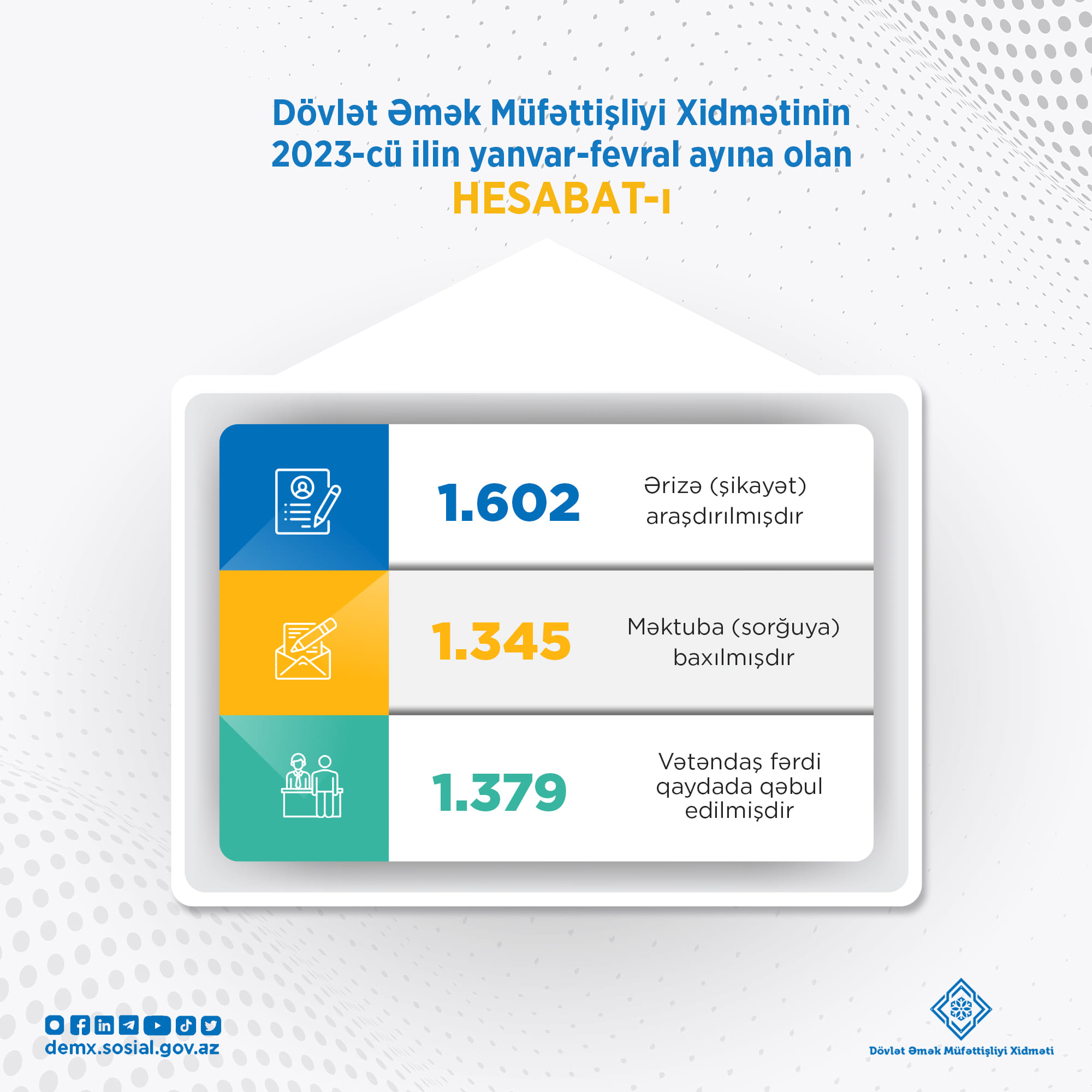2023-cü ilin yanvar-fevral ayları ərzində vətəndaşlardan daxil olmuş 1602 şikayət məzmunlu ərizə, eləcə də müxtəlif müəssisə, idarə və təşkilatlar tərəfindən göndərilmiş 1345 məktub araşdırılaraq cavablandırılıb