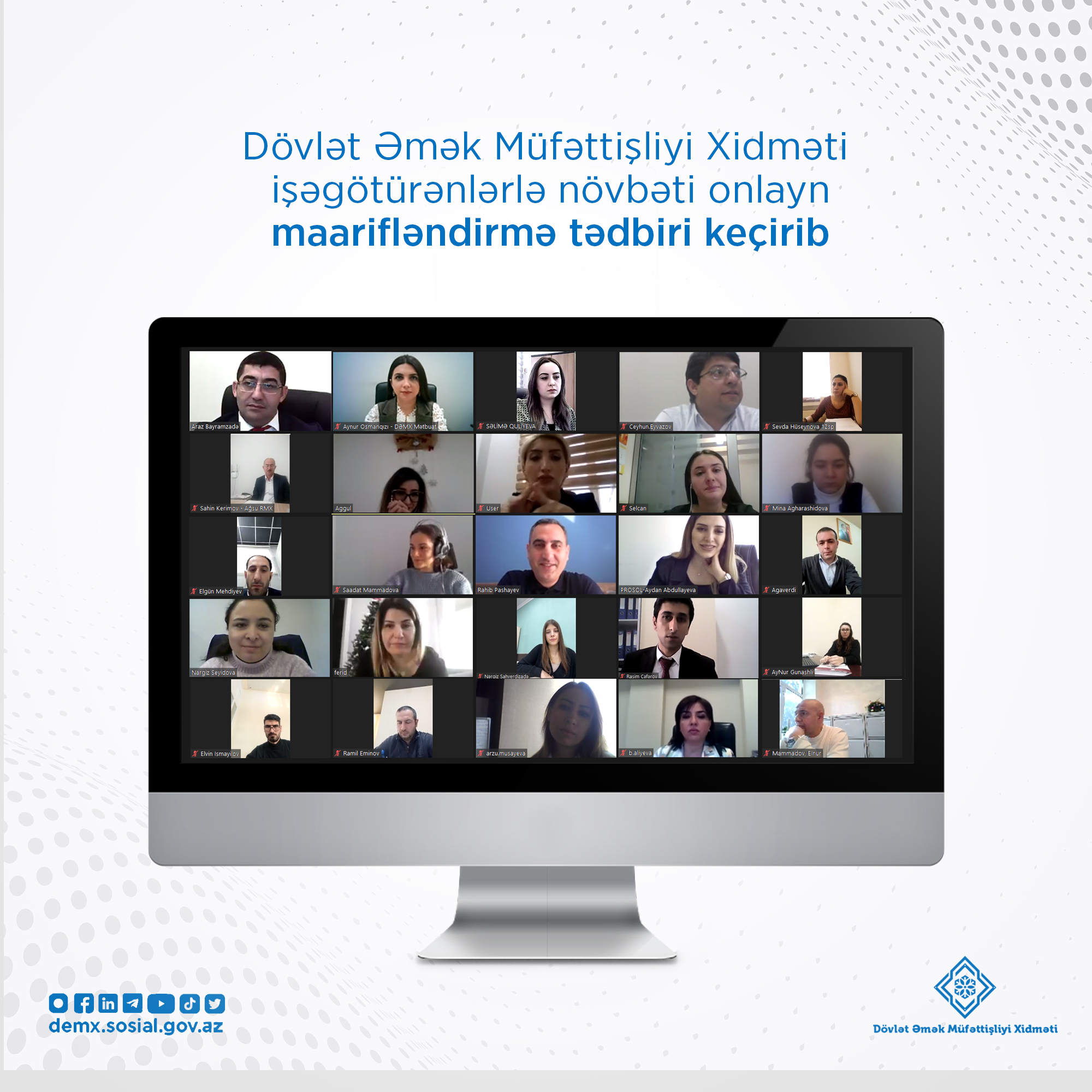 Dövlət Əmək Müfəttişliyi Xidməti işəgötürənlər üçün “İş vaxtının növləri, iş vaxtının rejimi və iş vaxtından artıq vaxtda işin tənzimlənməsi qaydaları” mövzusunda növbəti onlayn maarifləndirici tədbir keçirib